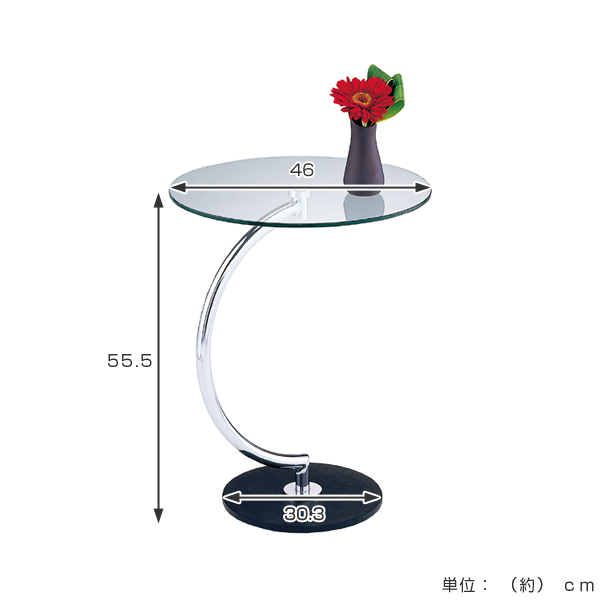 お洒落なガラス天板のサイドテーブルです。8mmの厚強化ガラスを使用し飛散防止加工を施しているので、万が一割れてしまっても飛び散りにくく安心です。フレーム部分は半円型になっていてスタイリッシュな空間を演出してくれます。リモコンやケータイ、飲み物を置くのにぴったりな幅46cmサイズです。