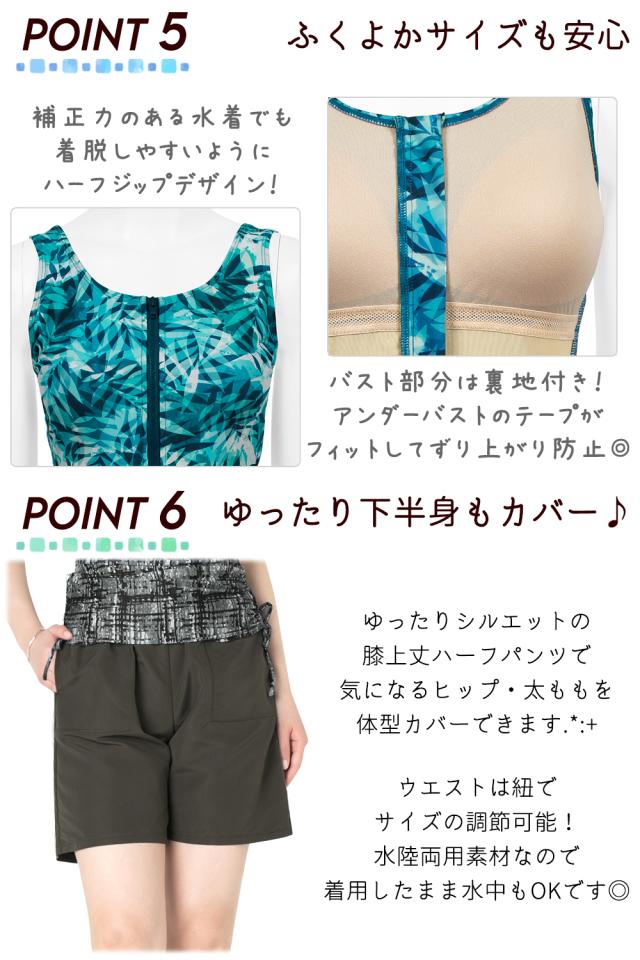補正力のある水着でも着脱しやすいように、ハーフジップデザインを採用。