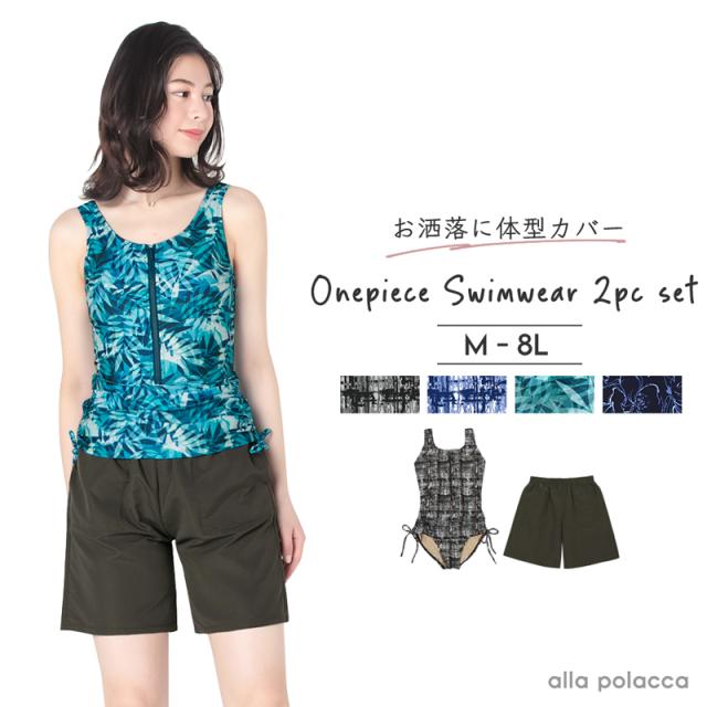 大きいサイズ 水着 レディース 体型カバー 体型補正 ワンピース水着 ボトム 2点セット ママ水着 女性 《レビュー記入で送料無料》 8L 7L 6L 5L 4L 3L LL 2L L M ぽっちゃり 40代 50代 60代 70代 80代 ミセス : alla polacca アラポラッカ 水着 ラファーファ