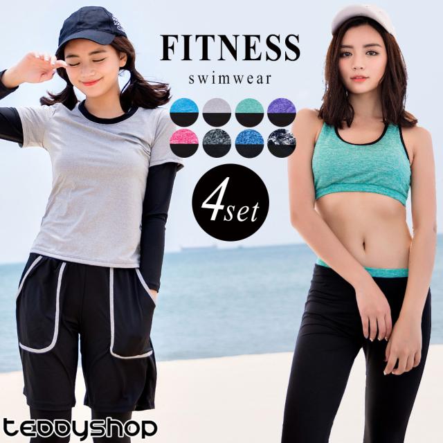 フィットネス水着 レディース 体型カバー水着 セパレート長袖ラッシュガード かわいい ママ水着 ミセス フィットネスウェア サーフパンツ ラッシュレギンス 4点セット スポーツ uvカット 紫外線対策 脚 お尻 太ももカバー UPF50+