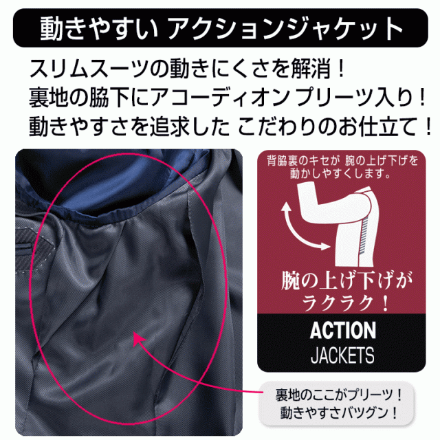 ジャケットは腕の動きがスムーズな「アクションプリーツ」を採用!