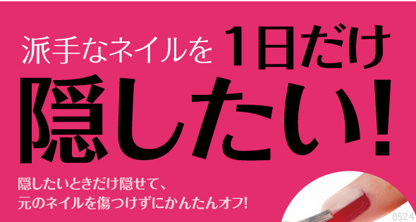 【メール便(ネコポス)対応】【2,200円以上でメール便 送料無料】重ねて塗れて簡単に剥がせるネイル用ウォーターベースコンシーラーです。ジェルネイルを一日だけ隠したい時にご使用ください。特に急な出張や冠婚葬祭,フォーマルな場面の間際にご使用頂き、いつでもどこでも直ぐにネイルアート等を隠す事ができます。また、お湯またはアルコールで下にあるジェルネイル等に傷をつける事なく、剥がす事ができます。 水溶性なので速乾&マニキュア特有のツンとした嫌なニオイがありません。日本人の肌に合う自然なベージュ。ぽってりとしたテクスチャーでジェル風のツヤのある仕上がりに!