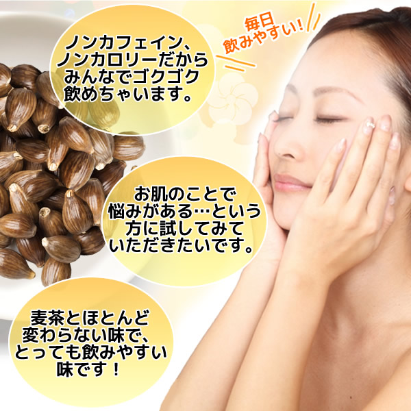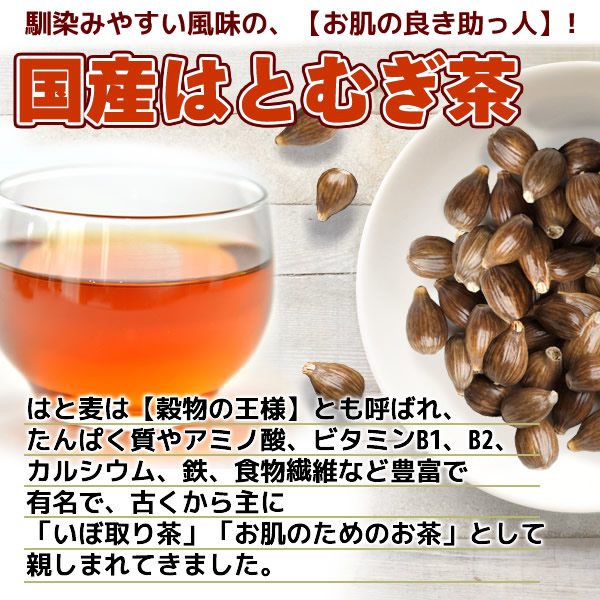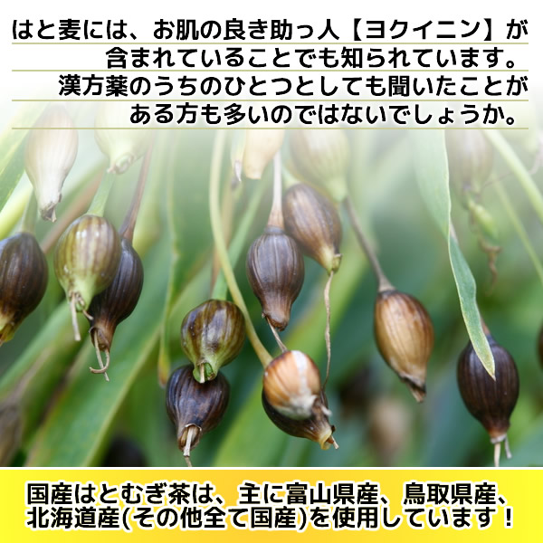 はと麦は【穀物の王様】とも呼ばれ、たんぱく質やアミノ酸、ビタミンB1、B2、カルシウム、鉄、食物繊維 などが豊富で有名で、古くから親しまれてきました。 はと麦には、健康維持の良き助っ人【ヨクイニン】が含まれていることでも知られています。 聞いたことがある方も多いのではないでしょうか。 麦茶とほとんど変わらない味で、とっても飲みやすい味です。 |