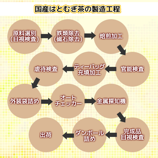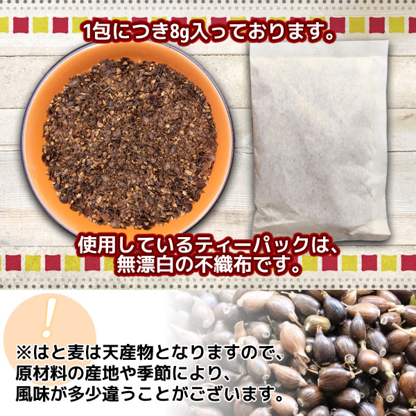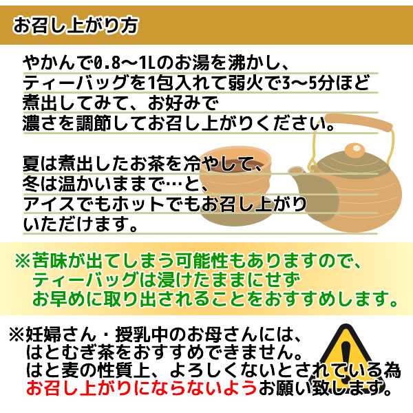 | ノンカフェイン・ノンカロリーですので、ご家族様や職場の皆様などで 飲んでいただきやすいお茶ですが、妊婦さん・授乳中のお母さんには、はとむぎ茶をおすすめできません。 はと麦の性質上よろしくないとされている為、お召し上がりにならないようお願い致します。 お召し上がり方の目安 0.8〜1Lのお湯を沸かし、ティーバッグを1包入れて弱火で3〜5分ほど煮出してみて、 お好みで濃さを調節してお召し上がりください。 夏は煮出したお茶を冷やして、冬は温かいままで…と、アイスでもホットでも お召し上がりいただけます。 ※苦味が出てしまう可能性もありますので、ティーバッグは浸けたままにせずお早めに 取り出されることをおすすめします。 |