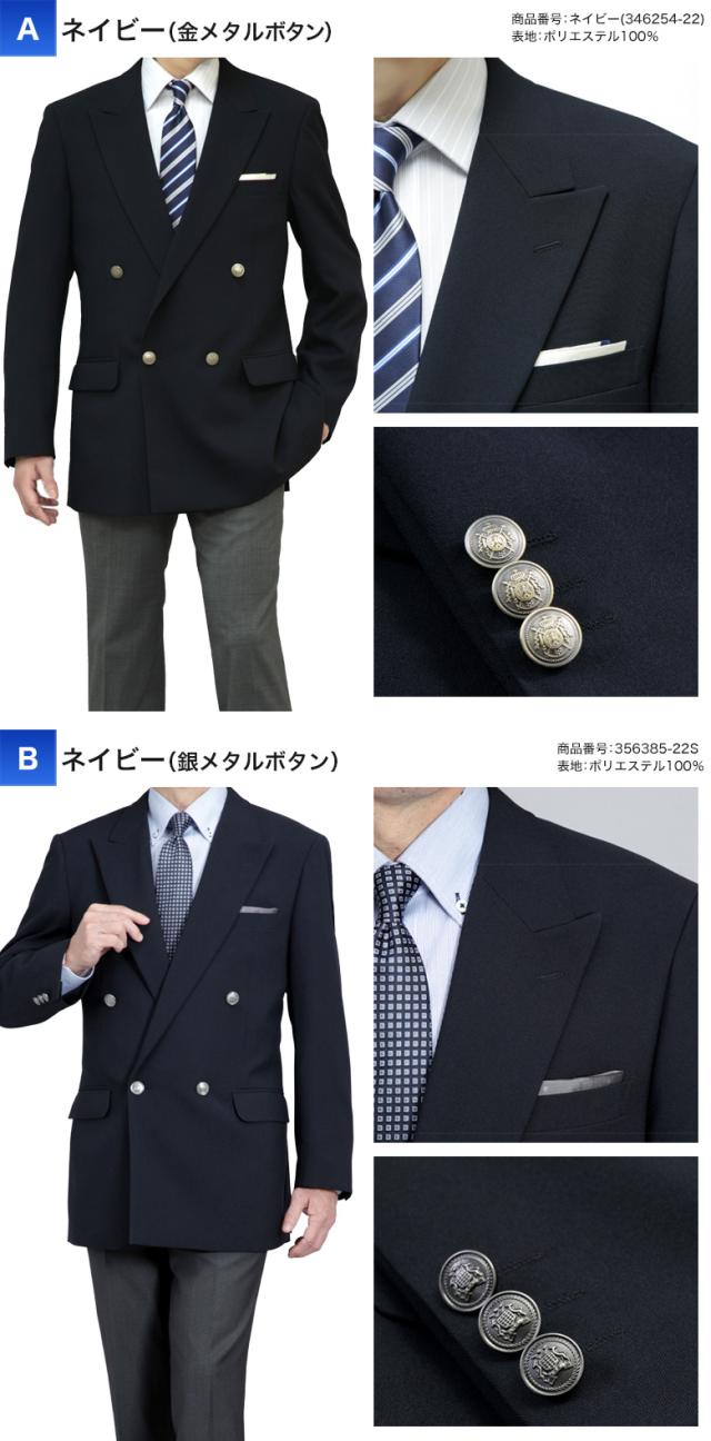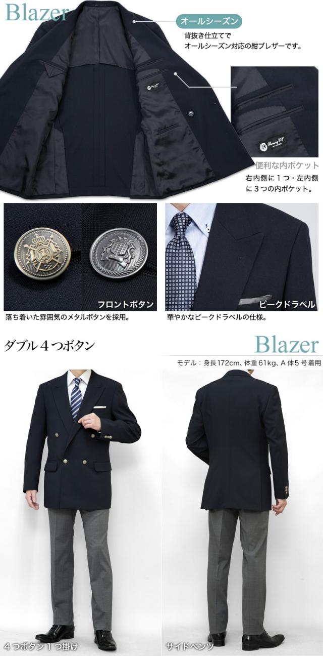 | 【オンオフ使える万能ブレザー・ダブル4ツボタン紺ブレザー】 ビジネスにもカジュアルにも着まわせる万能ジャケット。 コーディネート次第ではフォーマルなスタイリングも可能なオールマイティウェアです。落エンブレム(紋章)入りのメタルボタンはアンティークゴールドの「本格派金ボタン」と、シックな「艶消し銀ボタン」を使用し、上品な雰囲気を醸し出しています。オールシーズンに対応する背抜き仕立てで、 シワに強いポリエステル素材を使用。一着あればボトムスやインナー、シーンを選ばず着用できる万能ジャケットです。 |
