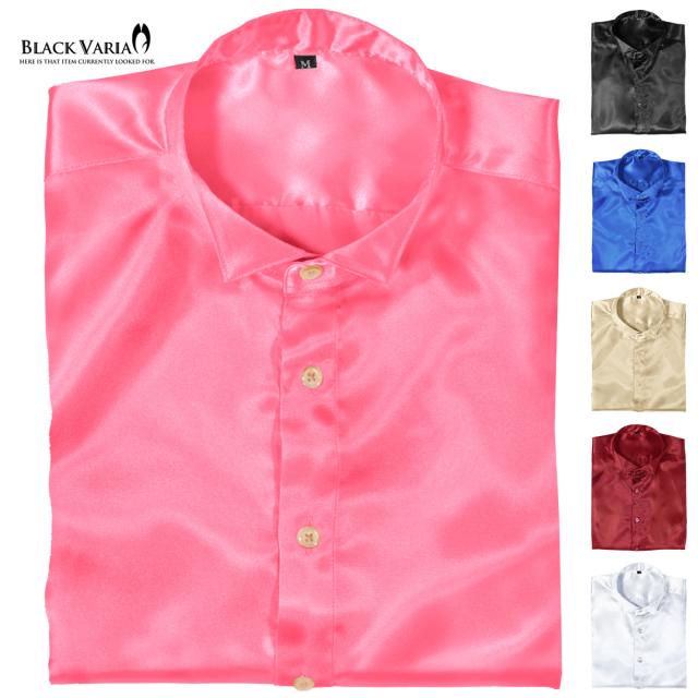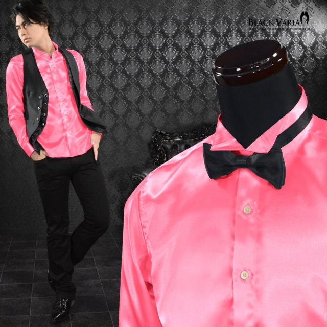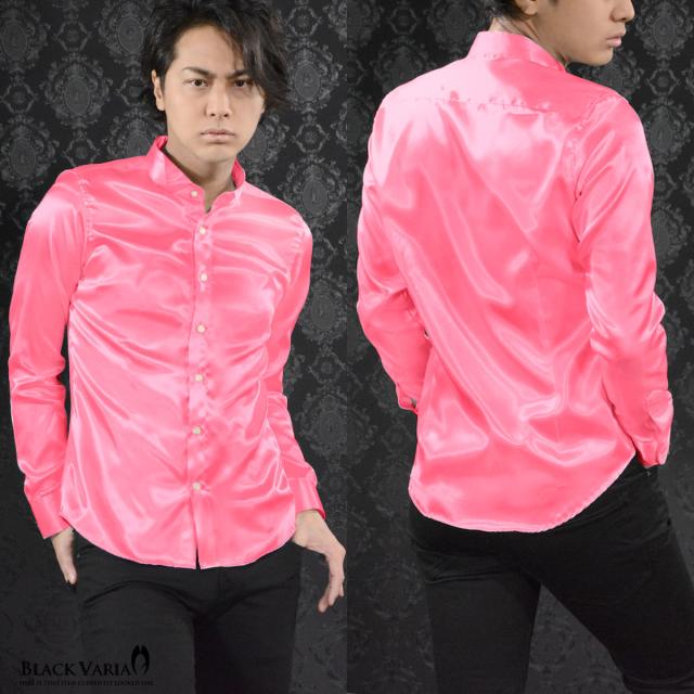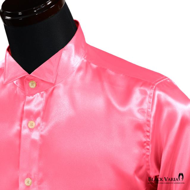 サテンシャツ ドレスシャツ 長袖 ウィングカラー 無地 光沢 衣装 ユニフォーム 発表会 メンズ 日本製(ピンク桃) 161208