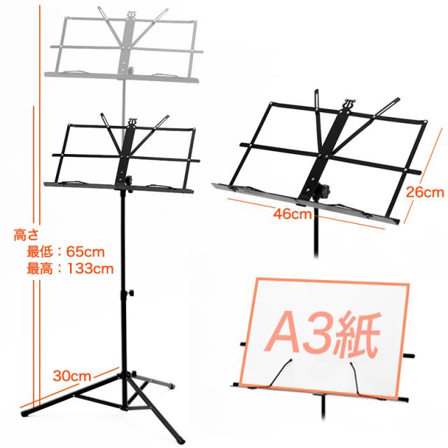 譜面台寸法:幅46cm 高さ26cm(およそA3用紙)