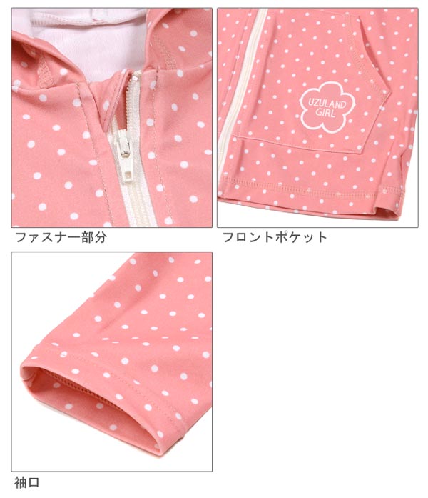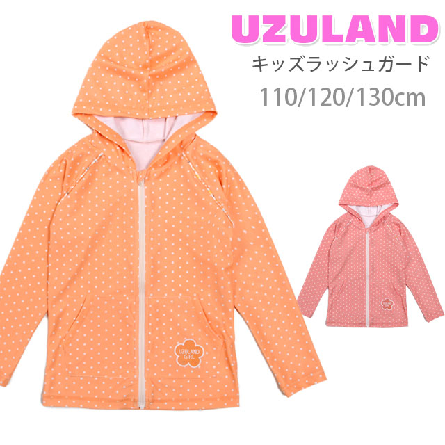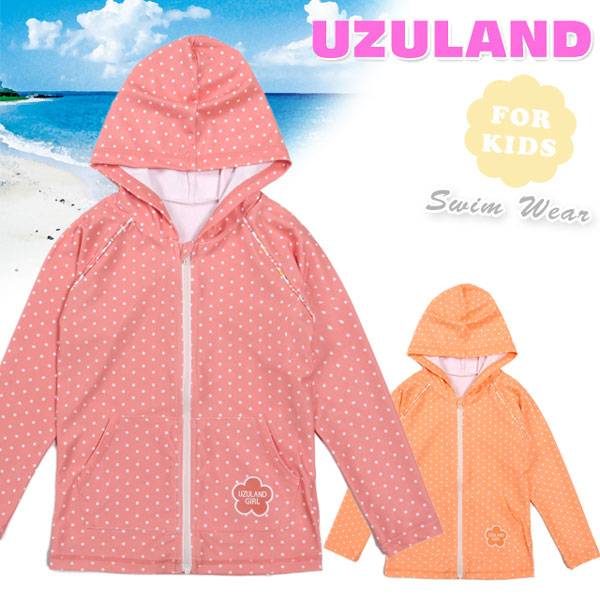 UZULAND(ウズランド)の女の子用ラッシュガード水着。水玉柄がさわやかで夏らしいイメージ。UPF50+で紫外線からお肌を守ります。柔らかい手触りの素材感で着用後も動きやすく、ジップアップタイプなので着脱もラクラク。プールや海・川などアウドドアのレジャーに活用してください。