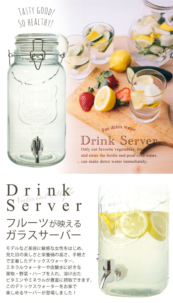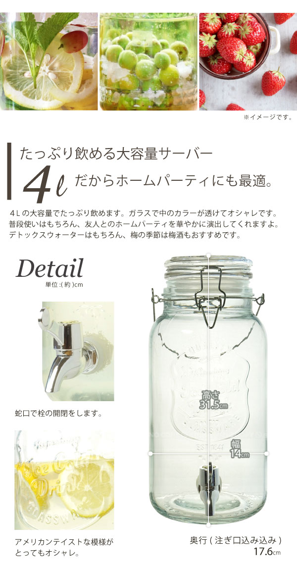 ガラス サーバー ドリンクサーバー4L デトックスウォーター フレーバーウォーター フルーツウォーター サングリア 梅酒 果実酒 ウォーターサーバー パーティ ダイエット 美容 インテリア オシャレ フォトジェニック