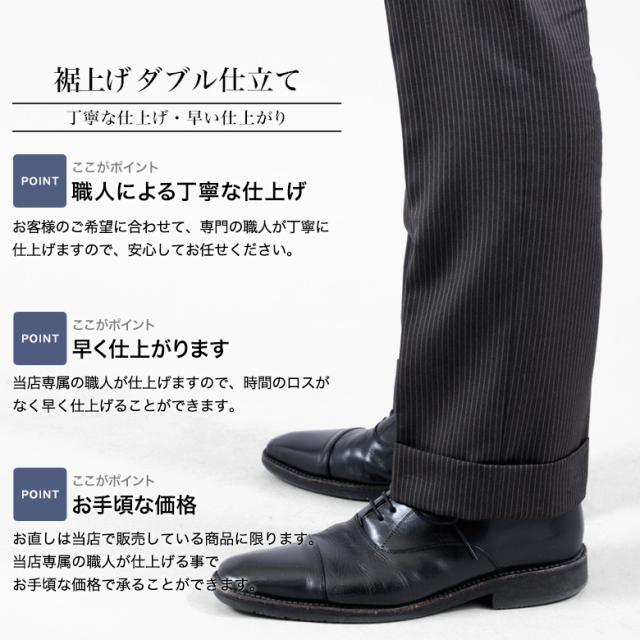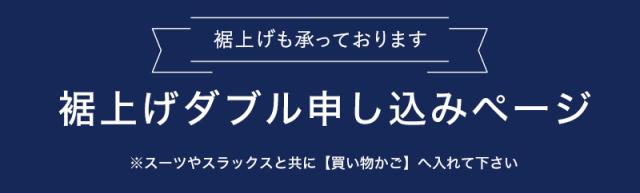 | ・当店販売のスーツやスラックスとともに「買い物かご」に入れてください ・股下サイズを必ずお選びいただき、ご注文ください。(採寸方法詳細は上記をご覧ください) ・ご注文いただくスラックスの本数分と、裾上げの本数が合うように個数を入力してください。 ※2024年7月より裾上げダブルは「ホック仕様」から「糸留め仕様」に変更しました。 |