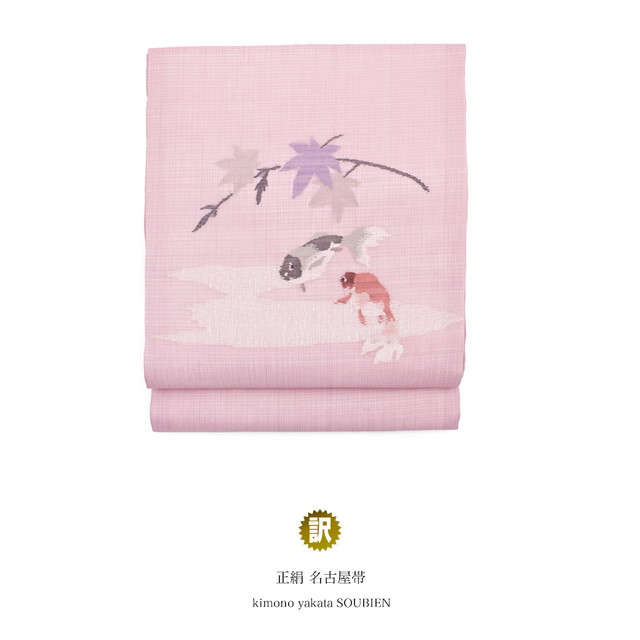 名古屋帯 九寸名古屋帯 訳あり 薄紫色 紅藤色 パープル 紅葉 鯉 すくい織り お太鼓柄 正絹 名古屋仕立て なごや帯 おび工房 夏向き カジュアル なごや帯 仕立て上がり