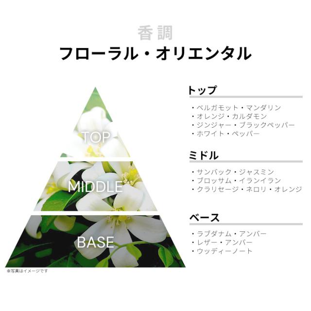 ベルガモット、マンダリン・オレンジ、ジンジャー、カルダモン、ブラックペッパー、ホワイト・ペッパーなどが、ヴィヴィッドでソフィスティケートされたシトラス・スパイシーを香り立たせるトップから、