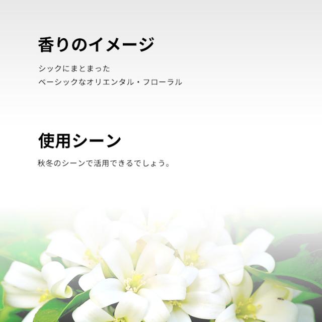 香りは、タイムレスなフローラル・オリエンタルの香調がベース。王道で飽きのこないようなアイテムにしあげられております。