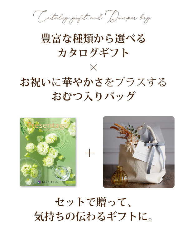 カタログとおむつが入ったバッグで華やかで印象に残るギフトに。