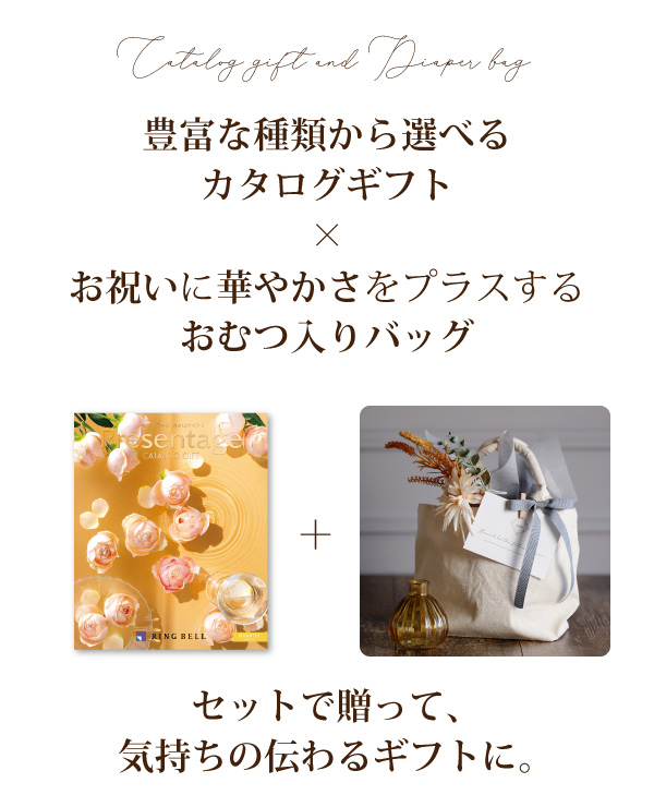 カタログとおむつが入ったバッグで華やかで印象に残るギフトに。