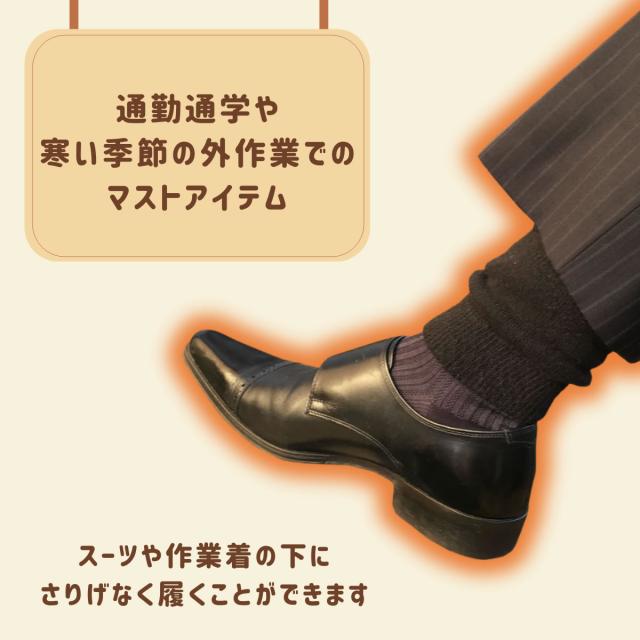 - 今まで使っていたものの片方を紛失してしまい再度購入しました。ふくらはぎから足首までピッタリとフィットしてとても温かいです。かさばらないのでズボンをはいても気になりません。ただ上下を見きわめるのに時間が...