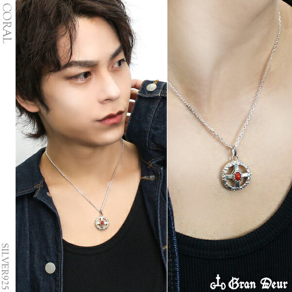 シルバー925 メンズ ネックレス 唐草 アラベスク 十字 ネイティヴ 天然石 スリーピングビューティ サンゴ