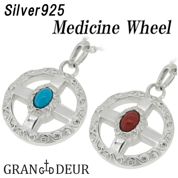 【GRAN DEUR】メディスンホイール ターコイズ コーラル シルバー ネックレス(チェーン付きペンダントトップ)