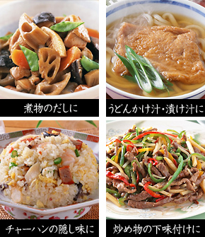 お吸い物、鍋、出し巻卵、チャーハン、うどんなど、ありとあらゆる料理の下味に。