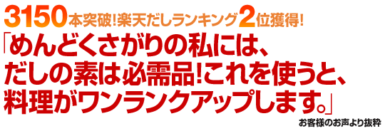 お忙しい主婦の方におすすめ、いつもの料理に数滴たらすだけで、料理の腕がワンランクもツーランクもアップする魔法のだしです。