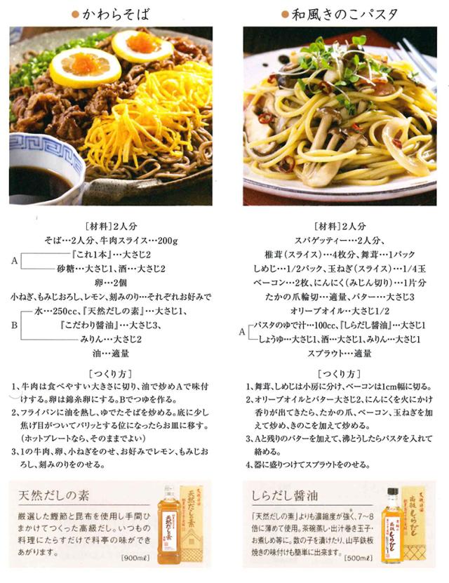 原材料:淡口醤油(新式醸造)、風味原料(かつおぶし、こんぶエキス)みりん、砂糖、食塩、調味料(アミノ酸等)、甘味料(天草、サッカリンNa)、保存料(パラオキシ安息香酸)(原材料の一部に大豆、小麦を含む)