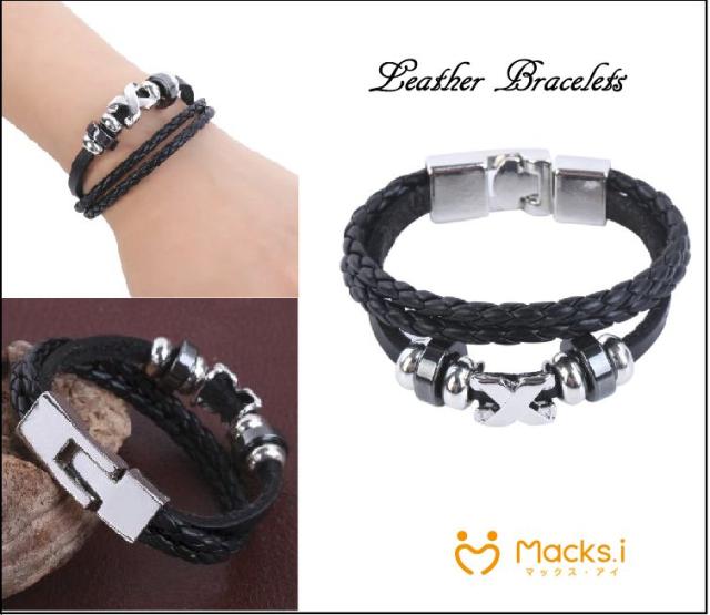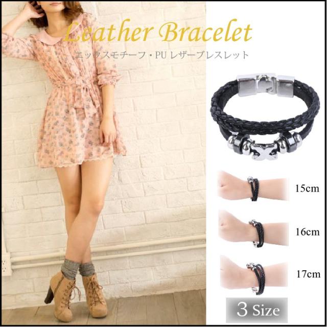 チタン製のエックスモチーフのパーツを組み込んだレザーブレスレットです。
