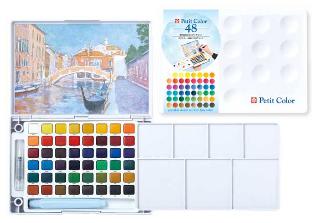 固形水彩48色、水筆スタンダードサイズ(中)、パレット、スポンジ、説明書(水彩画の描き方)