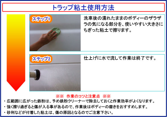 ◎ 洗車の後などボディーが濡れた状態のままザラザラの気になる箇所を粘土でこすり、水で流すだけでOK!ボディーを触れば効果はすぐに実感できます!
