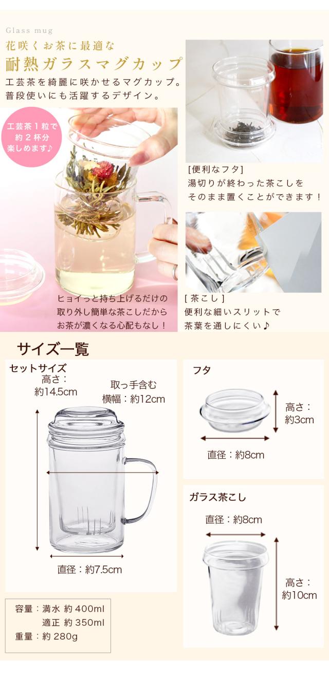 | 内 容 量 | ・ガラス茶こし付きマグカップ 1個 ・工芸茶5種類(萬紫千紅 1個 ・茉莉仙子 1個 ・百合花籠 1個 ・金花彩彩 1個 ・東方美人 1個) |