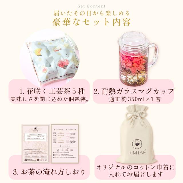 リムテー お歳暮 冬ギフト ギフト カーネーション 工芸茶 5種 耐熱ガラスマグカップ付き いやしセット 花 咲く お茶 5種 中国茶 プレゼント ギフト 詰め合わせ 花茶 誕生日 内祝い ジャスミン茶 人気 実用的 送料無料