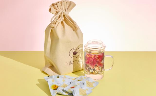 お湯で花咲く工芸茶と茶こし付きマグカップのセット。