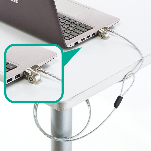 狭い場所でも脱着が容易なL字型シリンダの一体型セキュリティワイヤー。