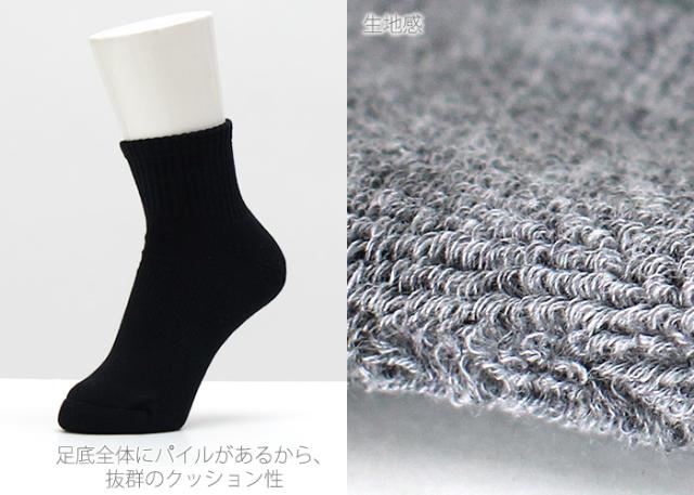 | 特長 | 足底がタオル地のようなパイル編み加工になっているので、クッションのように衝撃を吸収し、足底をやさしく包み込んでくれます。 スポーツやウォーキングなどにも最適なソックスです。 |