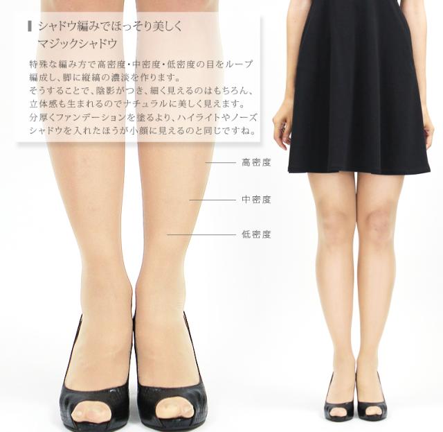 ![]() | ■マジックシャドウ 特殊な編み方(※)で脚に縦縞の濃淡を作り、 光のマジックで脚ほっそり。 (※特許第2928762号) |