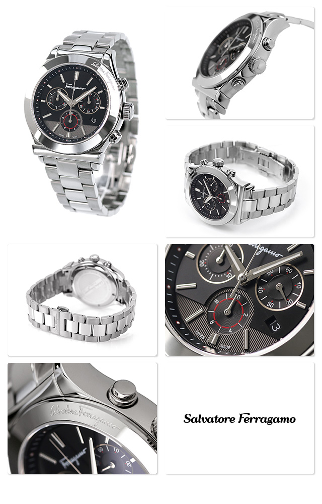 7年保証キャンペーン サルヴァトーレ・フェラガモ 1898 42mm クロノグラフ スイス製 クオーツ メンズ 腕時計 FFM080016 Salvatore Ferragamo 1898 42mm アナログ ブラック ◆創業者の名を冠したサルヴァトーレ フェラガモは、靴の専門店でした。美しいデザイン、優れた技術、履き心地の良さで世界中にその名を轟かせ、現在ではトータルファッションブランドとして知られています。フェラガモウォッチは提携工場での組み立てを行っており、スイス製のムーブメントを用いています。伝統的なイタリアのクラフトマンシップを随所に生かし、シンプルながらも洗練された個性を感じさせるデザインが魅力です。 ブランドのアイコンである、ガンチーニ型を反復したケースが特徴。活動的でスタイリッシュな現代の旅行者をデザインコンセプトにし、絶妙なバランスのプロポーションとシンプルなデザインで、カジュアルで洗練された大人に向けたニュースタイルを演出。クラシックな優雅さと現代的な気品を併せ持ち、大人の男性の魅力を引き出してくれます。