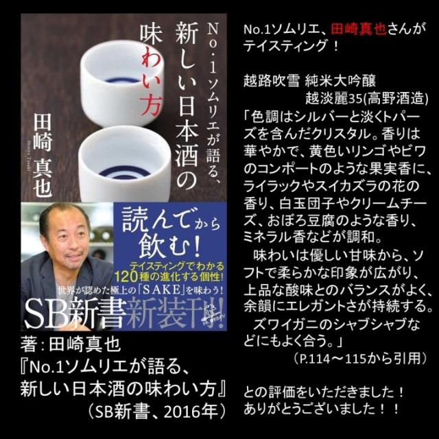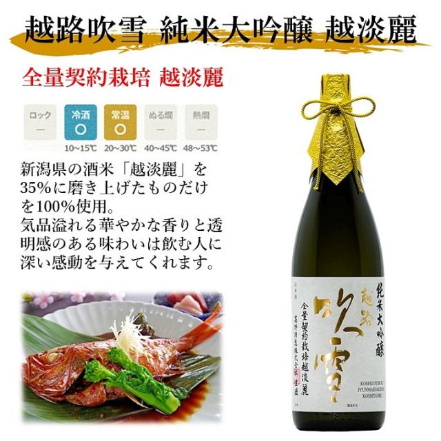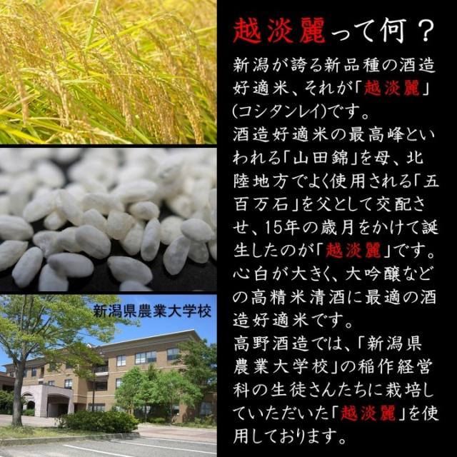 新潟県限定の酒造好適米「越淡麗」を35%に磨き上げたものだけを100%使用し、長期低温発酵で丹念に仕込みました。