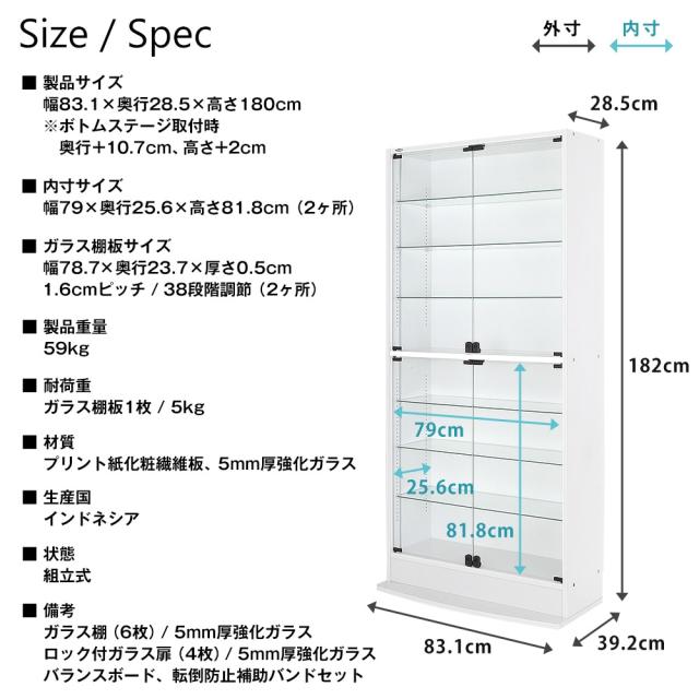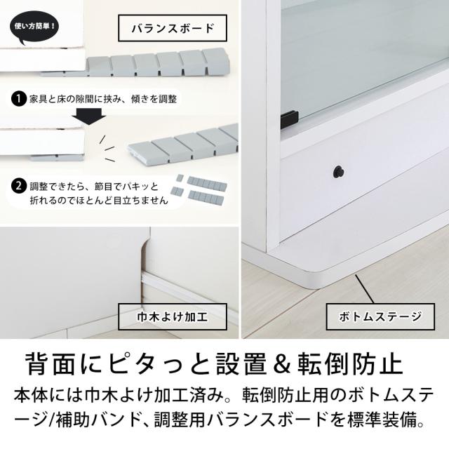 備考 | ガラス棚(6枚)/5mm厚強化ガラス、ロック付ガラス扉(4枚)/5mm厚強化ガラス、バランスボード、転倒防止補助バンドセット |
