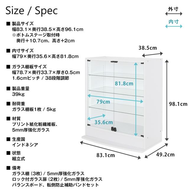 備考 | ガラス棚(3枚)/5mm厚強化ガラス、ロック付ガラス扉(2枚)/5mm厚強化ガラス、バランスボード、転倒防止補助バンドセット |