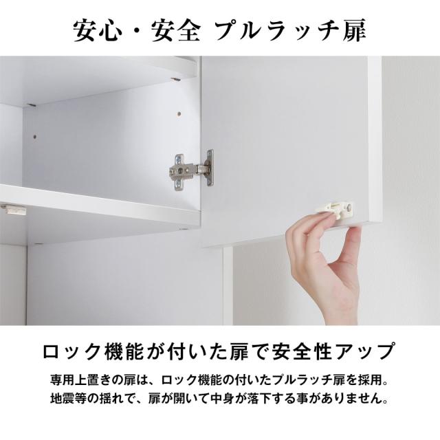 専用オプションロータイプ上置きロータイプは、コレクションラック本体に専用の上置きを装備すれば安全性に優れた天井つっぱり設置が可能になります。上置きの扉はプルラッチ式で地震などの際、扉が開き収納物が落下する事がなく安全です。