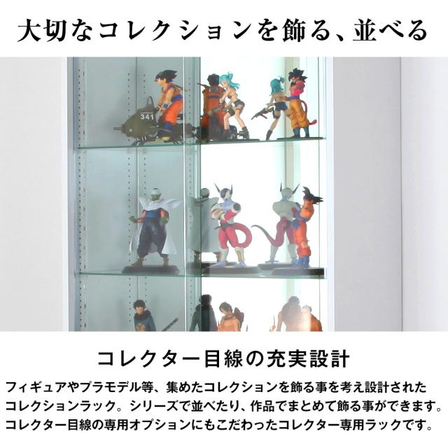 ワイドタイプのコレクションラックは、大型コレクションや大量のフィギュアもスッキリ収納できます。フィギュアやプラモデルなど自慢のコレクションをたくさん展示してコレクションルームに。スライド錠付引き戸扉で大切なコレクションを守ります。また、コレクションラックシリーズにはコレクター目線で考えた専用オプションが豊富。オプションを組み合わせれば、並べたコレクションをより美しくディスプレイする事ができます。