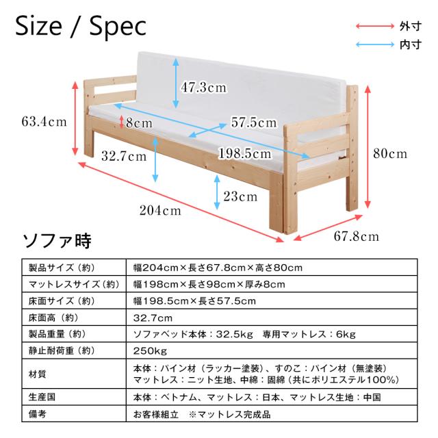 製品サイズ(約 | ベッドフレーム:幅204cm×長さ108cm×高さ80cm マットレス :幅98cm×奥行198cm×厚み8cm |