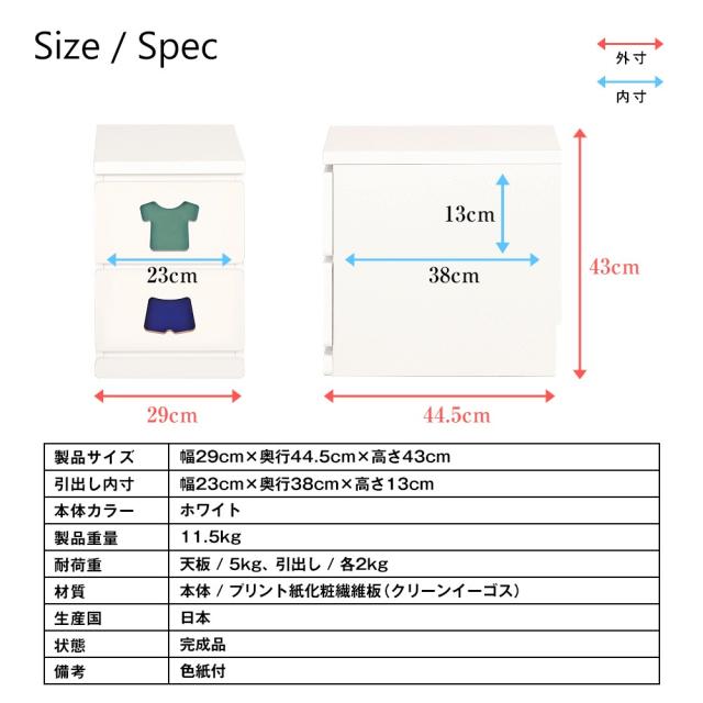 内寸(約) | 引き出し:幅23cm×奥行38cm×高さ13cm×2杯 |