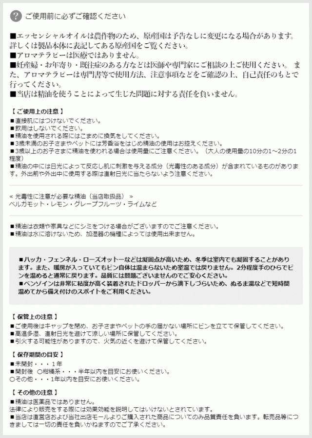 アロマテラピーで使用する際は、100%天然の「エッセンシャルオイル」をご使用ください。
