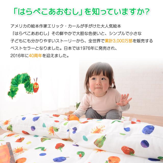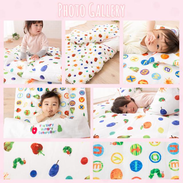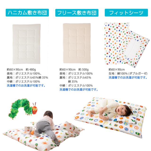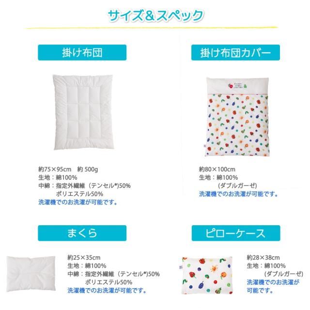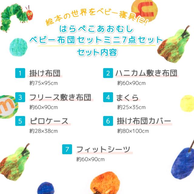 ■品名はらぺこあおむし/ベビー布団ミニ7点セット■セット内容 ・掛け布団約75×95cm 約0.5kg 生地;綿100% 中綿:指定外繊維(テンセル?)50% ポリエステル50%洗濯機でのお洗濯が可能です。・掛け布団カバー約80×100cm 生地;綿100% (ダブルガーゼ)洗濯機でのお洗濯が可能です。・ハニカム敷き布団約60×90cm 約 0.48kg表地:ポリエステル100%、裏地ポリエステル65%綿 35% 中綿:ポリエステル100%洗濯機でのお洗濯が可能です。・フリース敷き布団約60×90cm 約 0.5kg表地:ポリエステル100%裏地ポリエステル65%綿 35%中綿:ポリエステル100%・フィットシーツ約60×90cm生地;綿100% (ダブルガーゼ)・まくら約25×35cm 生地;綿100% 中綿:指定外繊維(テンセル?)50% ポリエステル50%洗濯機でのお洗濯が可能です。・ピロケース約28×38cm 生地;綿100% (ダブルガーゼ)洗濯機でのお洗濯が可能です。■製造国 日本製(敷き布団の側生地、洗濯ネットのみ中国製)■洗濯方法 全アイテム洗濯機洗い可能■配送 送料区分は160サイズとなります。