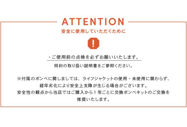 ライフジャケットの使用・未使用に関わらず、経年劣化により安全上支障が生じる場合がございます。