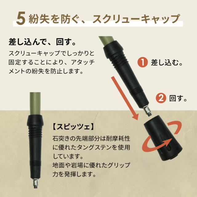 専用アタッチメントを付け替えることにより、街中でのポールウォーキングからトレッキングまで様々なシーンでご使用頂けます。