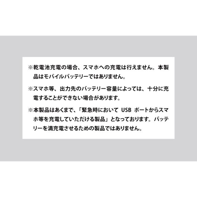 ※点灯中のUSBポートからの出力はバッテリー残量によっては発行が弱まったり、不安定になる場合があります。