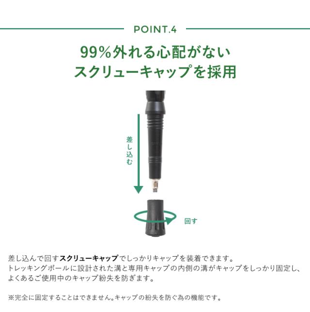 使用中に紛失しやすいポール先端のラバーキャップは、内側をスクリュー式の溝を作ることでキュッと固定し、抜けづらい仕様になっています。