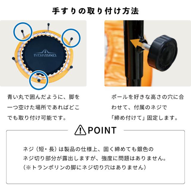 - 予約待ちの商品が届き、ワクワクしながら組立たのですが、手すりのネジがありませんでした。 すぐに連絡をさせていただくと、翌日にはネジを送ってくださいました。 迅速な対応感謝しております。 トランポリン...