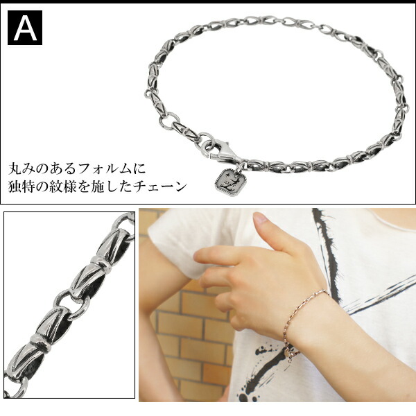 細身ながら程よい存在感を与えてくれる、個性的なデザインチェーンのシルバーブレスレット。
